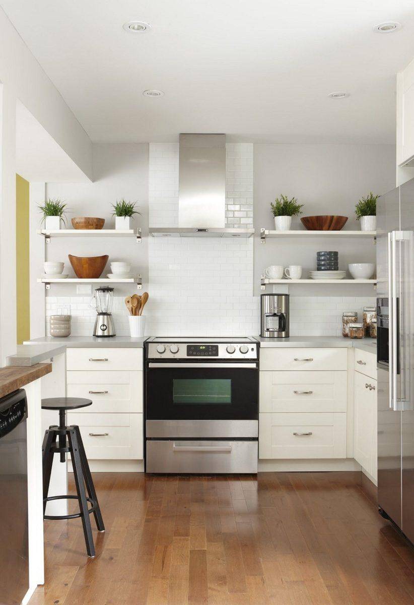 Еще один вариант удешевить кухню: сделать вместо верхних навесных шкафов открытые полки. На них можно разместить кухонную утварь, баночки со специями, красивую посуду. Так что не стоит боятся, что это будет плохо смотреться. Единственный минус – на полках будет скапливаться пыль.