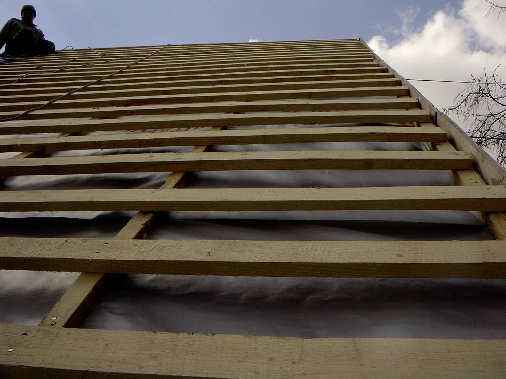 После того как стропильная система установлена, можно приступать к установке обрешетки. Шаг обрешетки зависит от кровельного материала. Например, для профнастила требуется обрешетка с шагом 40-50 см.