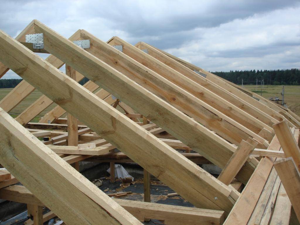 После установки стоек на них устанавливаем коньковый брус. Крепить его можно при помощи уголков и накладок. Для того чтобы крыша получилась симметричной проверьте расстояние до карнизов и углов вальмового ската. После установки стоек можно начинать крепить боковые стропила, которые верхним концом крепятся к коньку, а нижним – к мауэрлату.