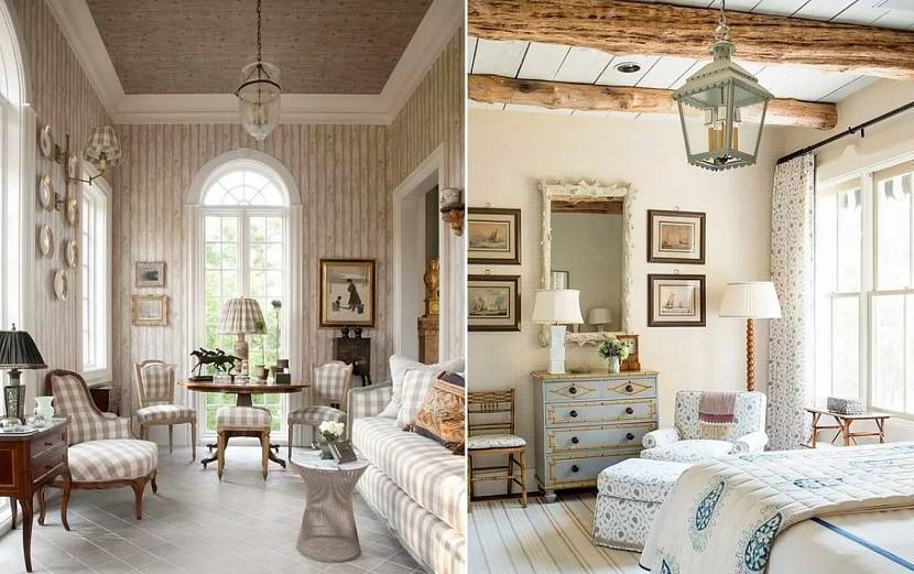 Деревенские стили легко узнать по натуральной отделке и уютной атмосфере. В интерьере много теплой древесины, приятной на ощупь. Вместо ярких красок используют приглушенные оттенки и фактурные поверхности. Роскошный рельеф каменной кладки визуально состаривает стены. Под потолком уместны массивные балки, на полках – антикварные фигурки или посуда.