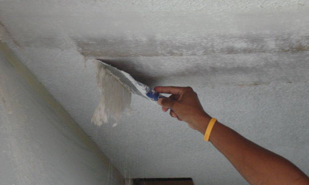 После того как раствор пропитает старое покрытие, оно легко снимается шпателем, а иногда просто щеткой с жесткой щетиной. Пока потолок окончательно не высох, его затирают сухой тряпкой так, чтобы можно было разглядеть трещины и повреждения. Самые маленькие расширяют шпателем и углубляют, для того чтобы можно было заделать ремонтным составом, и все это не вылезло под слоем краски.