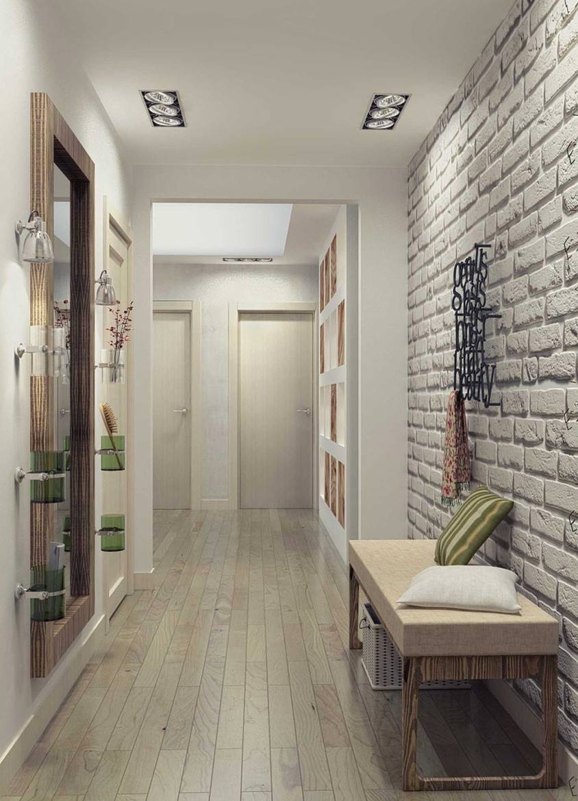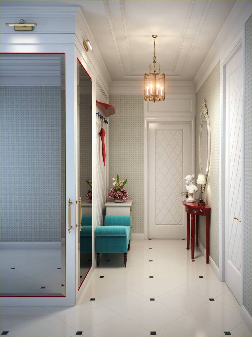 - в конце помещения устанавливается узкая банкетка, столик или консоль с зеркалом.
