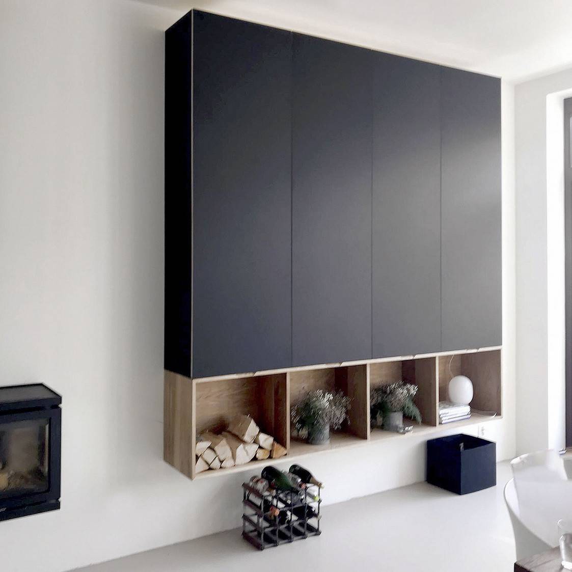 Когда мебель приставляется к стене, а наша задача максимально задействовать площадь и получить современный внешний вид, эта мебель должна стать стеной.