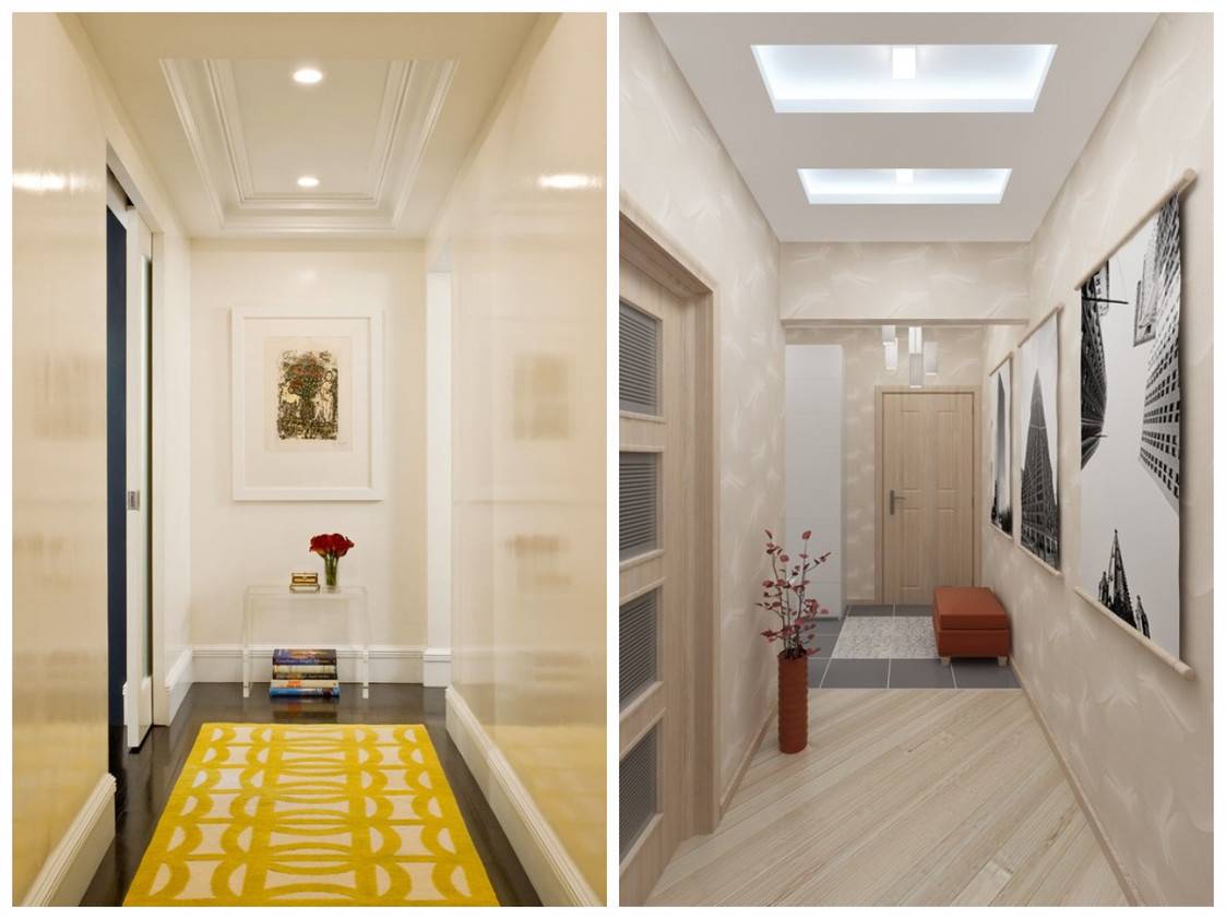 Чтобы правильно декорировать потолочную поверхность узкого коридора, следует учитывать рекомендации дизайнеров. Стоит использовать глянцевое натяжное полотно с эффектом отражения. Пол и потолок обязательно должны быть в единой цветовой гамме. Визуально добавить ширины поможет потолок с несколькими уровнями. Легкая конструкция не утяжелит помещение, а светодиодная подвеска с глянцем добавит объема коридору.