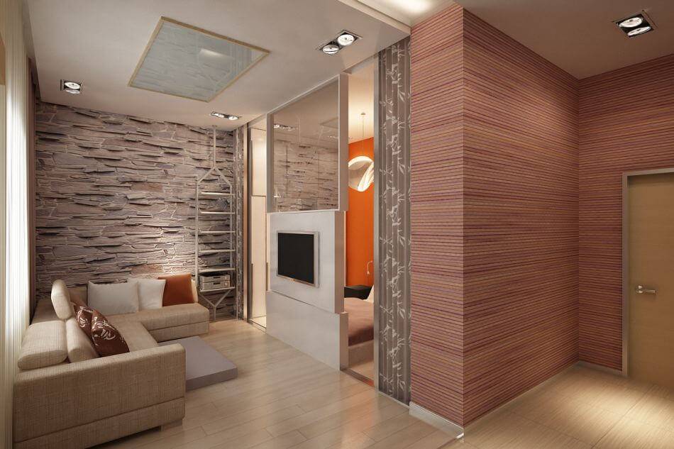 - Зонирование. Можно обозначить несколько сегментов, включая входной участок и вестибюль. Для выделения используйте мебель, оттенки и текстуры, различные материалы. Входная зона может иметь пол, облицованный плиткой. Остальную площадь оформите ламинатом или паркетом. Отлично для зонирования подходит коврик;