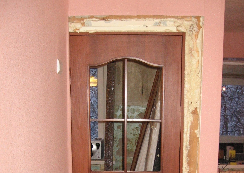 В новостройках дверные проёмы теоретически должны иметь размеры, близкие к стандартным. Однако на практике так случается далеко не всегда. В доме или квартире, где происходит реконструкция, перед установкой новых нужно демонтировать старые двери. Если при этом проём был повреждён, его необходимо восстановить — выровнять и оштукатурить.
