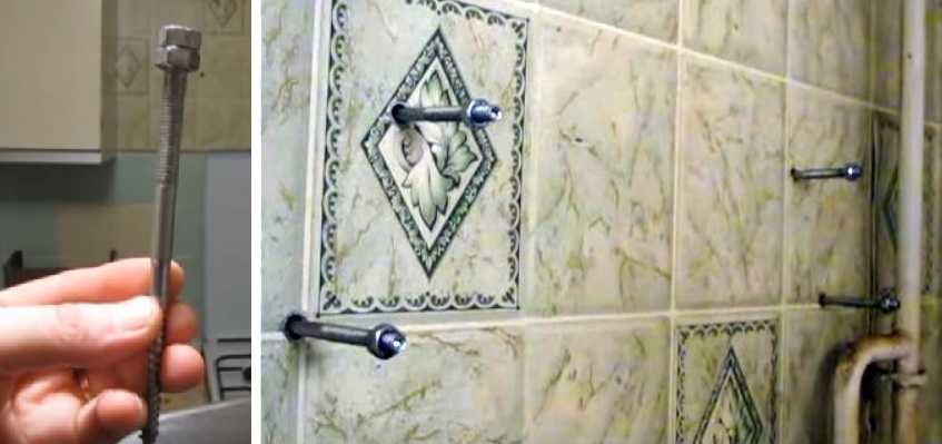 Второй вариант установить вытяжку за трубами — использовать шуруп-шпильку (второе название шпилька сантехническая). Они имеет резьбу для вкручивания в стену, гладкую часть, которая дает возможность отнести вытяжку на некоторое расстояние от стены и более мелкую резьбу с двумя гайками, которыми и будем фиксировать корпус. Есть эти шпильки разных размеров, выбирайте какой вам нужен, но все гайки сделаны под биту или восьмигранный ключ.