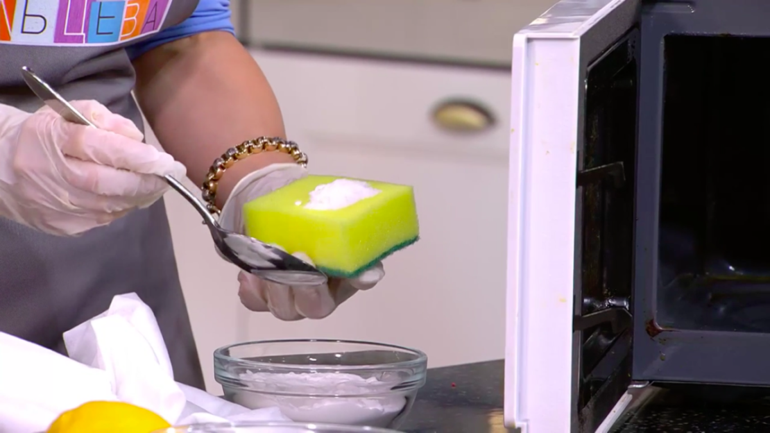 В стеклянной таре разводят соду, которая при нагревании осядет конденсатом внутри микроволновки. Под действием сыпучего вещества пятна жира, потеки, брызги размякнут.