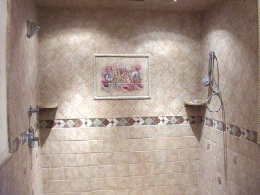 Предпочтительней плитка однотонная или с мелким незамысловатым узором. Панно с крупным рисунком в маленькой ванной неуместно. А вот горизонтальные или вертикальные вставки из плитки с мелким рисунком на фоне однотонной или из более яркой плитки на фоне светлой допустимы.