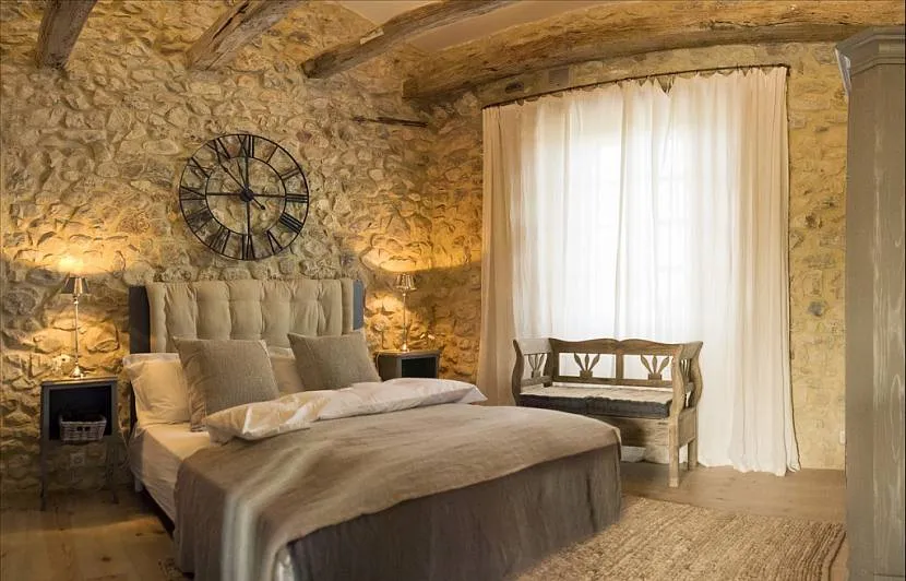 Уютное мягкое сочетание камня и дерева в спальнеИсточник dizain.guru