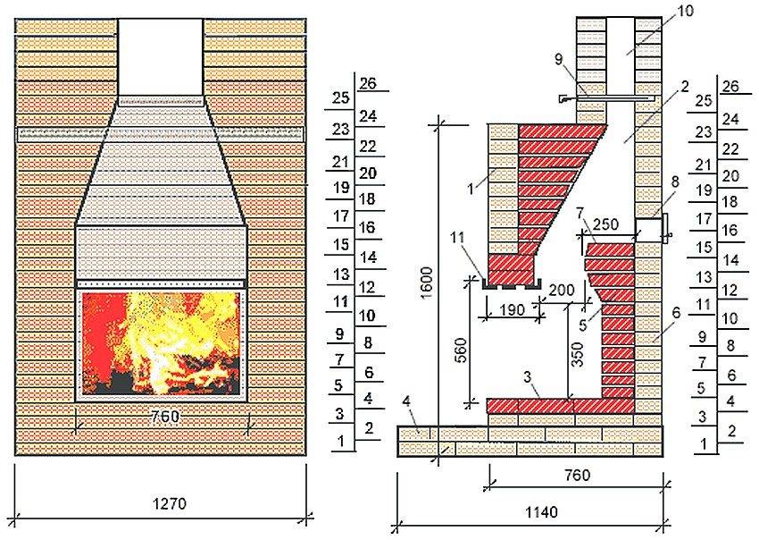 Стандартная схема кладки кирпичного камина включает в себя такие элементы (двигаясь снизу вверх, как идет кладка):