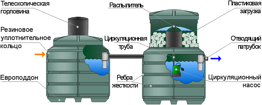 Перечень задач довольно прозрачен, и из него можно вывести составные части конструкции автономной системы канализации: