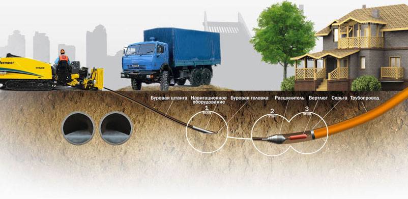 На приусадебном участке могут быть препятствия, мешающие землеройным работам: деревья, постройки и другие объекты ландшафта. В этом случае открытым способом канализацию проложить не удастся, поэтому приходится обращаться к специалистам, которые могут проложить трубопровод, не нарушая целостности грунта.