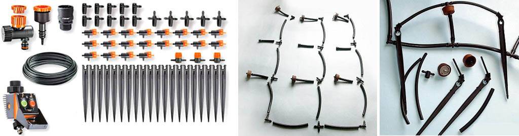 Затраты на создание капельного полива в небольшой теплице, приведенные на единицу ее продуктивной площади, много меньше, чем для открытого грунта, а продуктивность также много выше. Поэтому капельное орошение теплиц быстро набирает популярность, и в продаже имеются полные наборы их элементов, включая контроллер, для теплиц стандартных размеров, слева на след. рис. Цена комплекта существенно ниже, чем при покупке компонент в розницу. Дополнительный плюс – добросовестные продавцы дают гарантию на все, кроме относительно недорогого шланга. Поэтому систему можно вначале примерить всухую на отдельной площади, собрать, сделать пробный пуск, а уж затем, если все в порядке, устанавливать на месте.