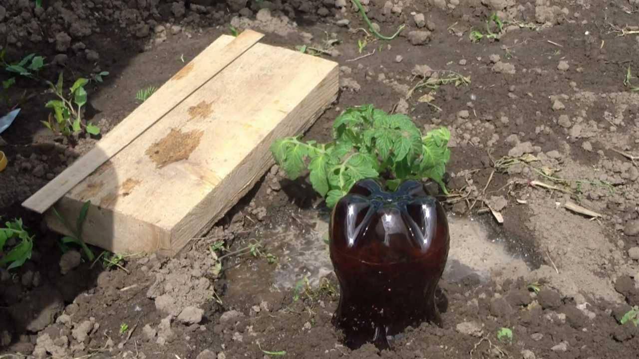 На расстоянии в 15-20 см от стебля растения аккуратно выкапываем небольшую ямку глубиной 10-15 см. Далее в эту ямку крышкой вниз вставляем бутылку под углом от 30-ти до 45 градусов и прикапываем. Во время установки пластиковой бутылки будьте осторожны, чтобы не повредить корневую систему томата.
