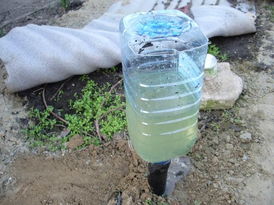 - если бутылки не вкопаны в землю, а подвешены на опоре, возможен ожог или загнивание листьев, на которые будет постоянно течь вода;