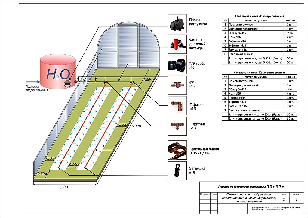 Применение капельного орошения для частных хозяйств умеренно-влажного климата экономически наиболее выгодно в теплице. Дли примера на рис. даны чертежи системы капельного полива теплицы 6х3 м и спецификации 2-х вариантов комплектующих для нее.