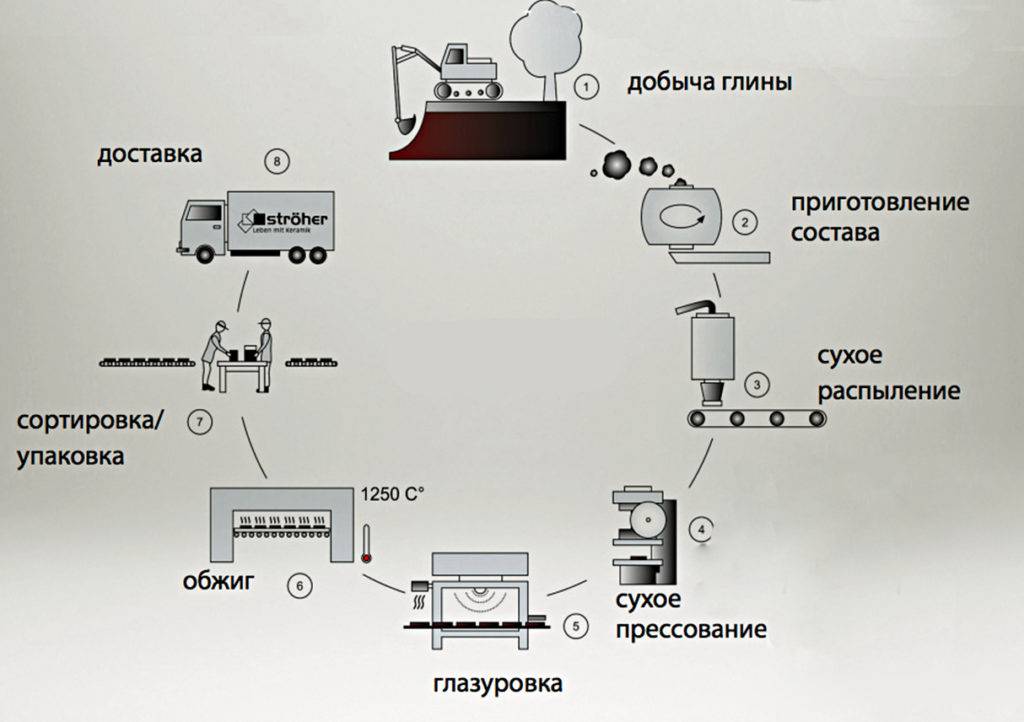 Керамогранит изготовляется из особенной смеси каолиновых глин с добавлением минеральных пигментов, кварцевого порошка, металлических оксидов в качестве красящих веществ. Он носит название керамического по той причине, что в обязательном порядке проходит стадию высокотемпературного обжига, совмещенную с прессованием.