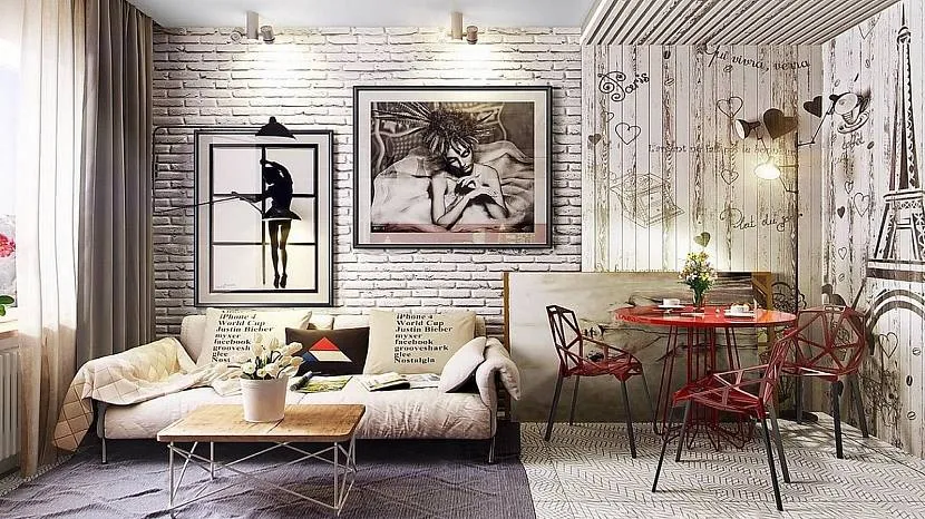 Поп-арт с его яркими картинами, необычными аксессуарами и сочными образами прекрасно гармонирует с однотонной кладкой природного цвета;