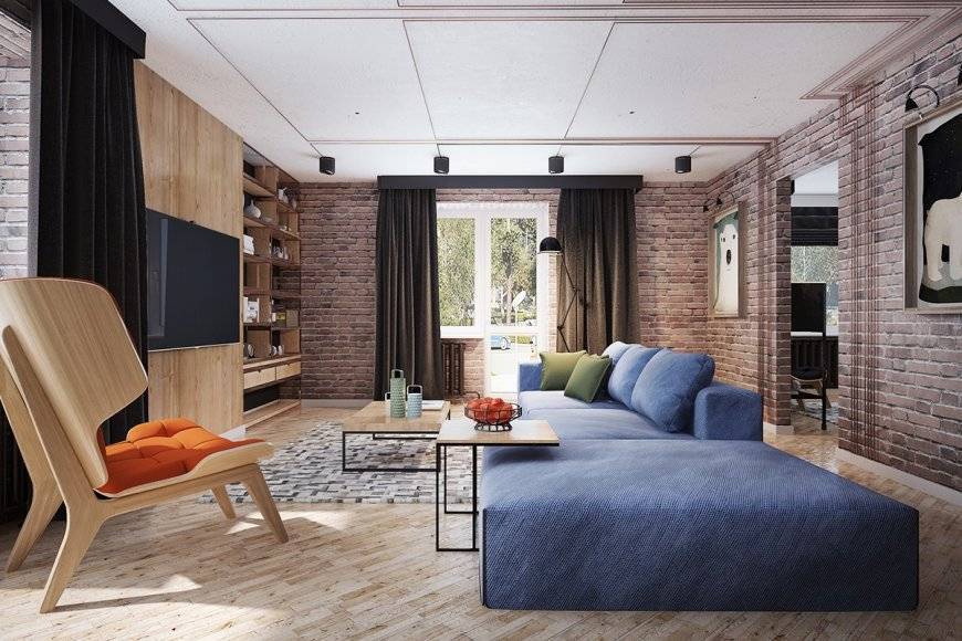 Кирпичная стена в гостиной — отличный фон для зоны отдыха