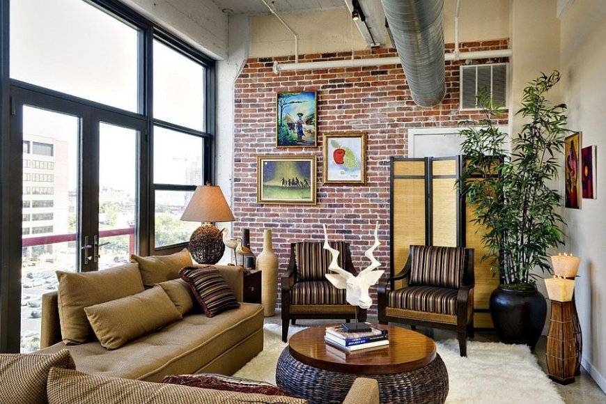 На фоне классических кирпичных стен еще ярче и интереснее смотрятся этнические картины и предметы интерьера