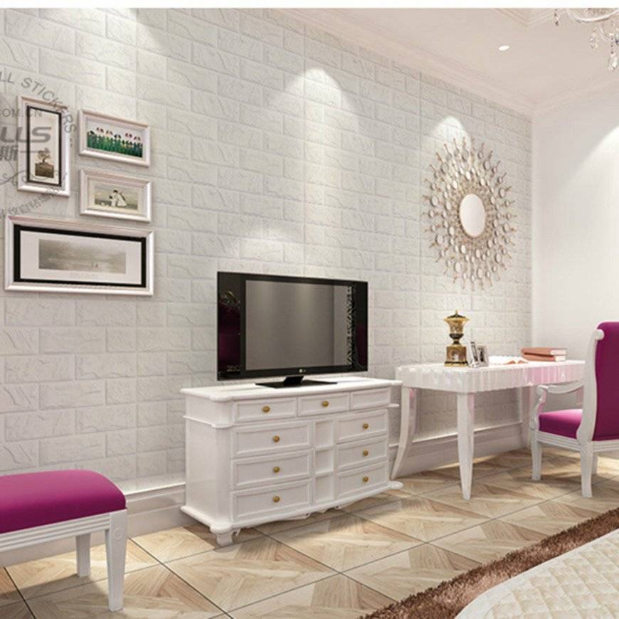 Белые кирпичные обои на акцентной стене украсят комнату, не отягощая пространство