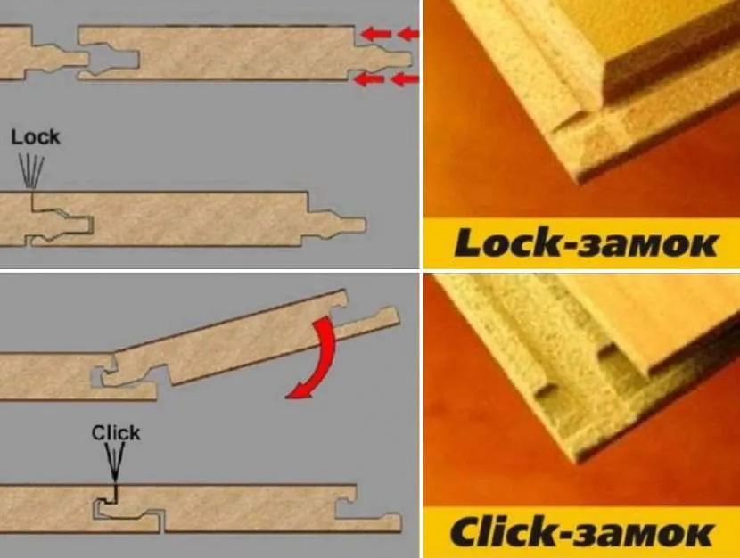 Замковая система ламината бывает двух типов – click и lock. Они отличаются формой гребня и паза, вследствие чего соединение планок осуществляется по-разному.