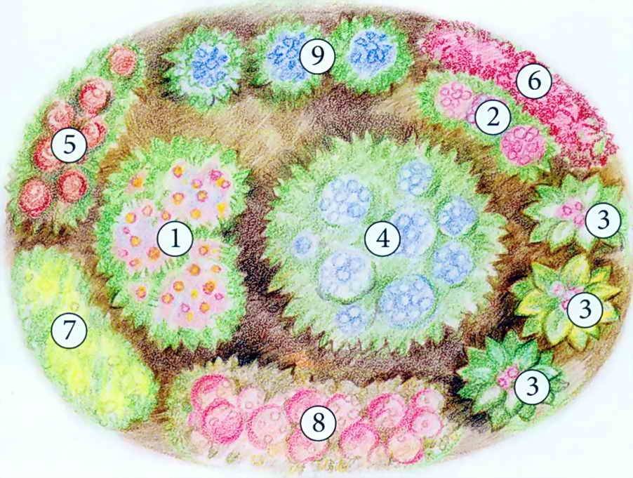 Такая композиция впишется в большую площадку, а ее многолетние растения не придется пересаживать. Можно выбрать от трех основных цветов, а сопровождающие их менять по сезонам.
