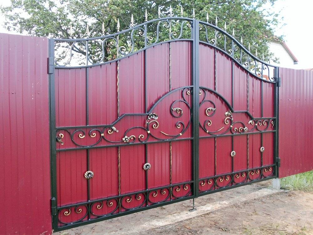 Некоторые модели ворот дополнены глухими листами железа, поверх каких прикреплены украшения из кованых элементов. Глухие ворота с элементами ковки выглядят прекрасно и закрывают обзор участка со стороны улицы.