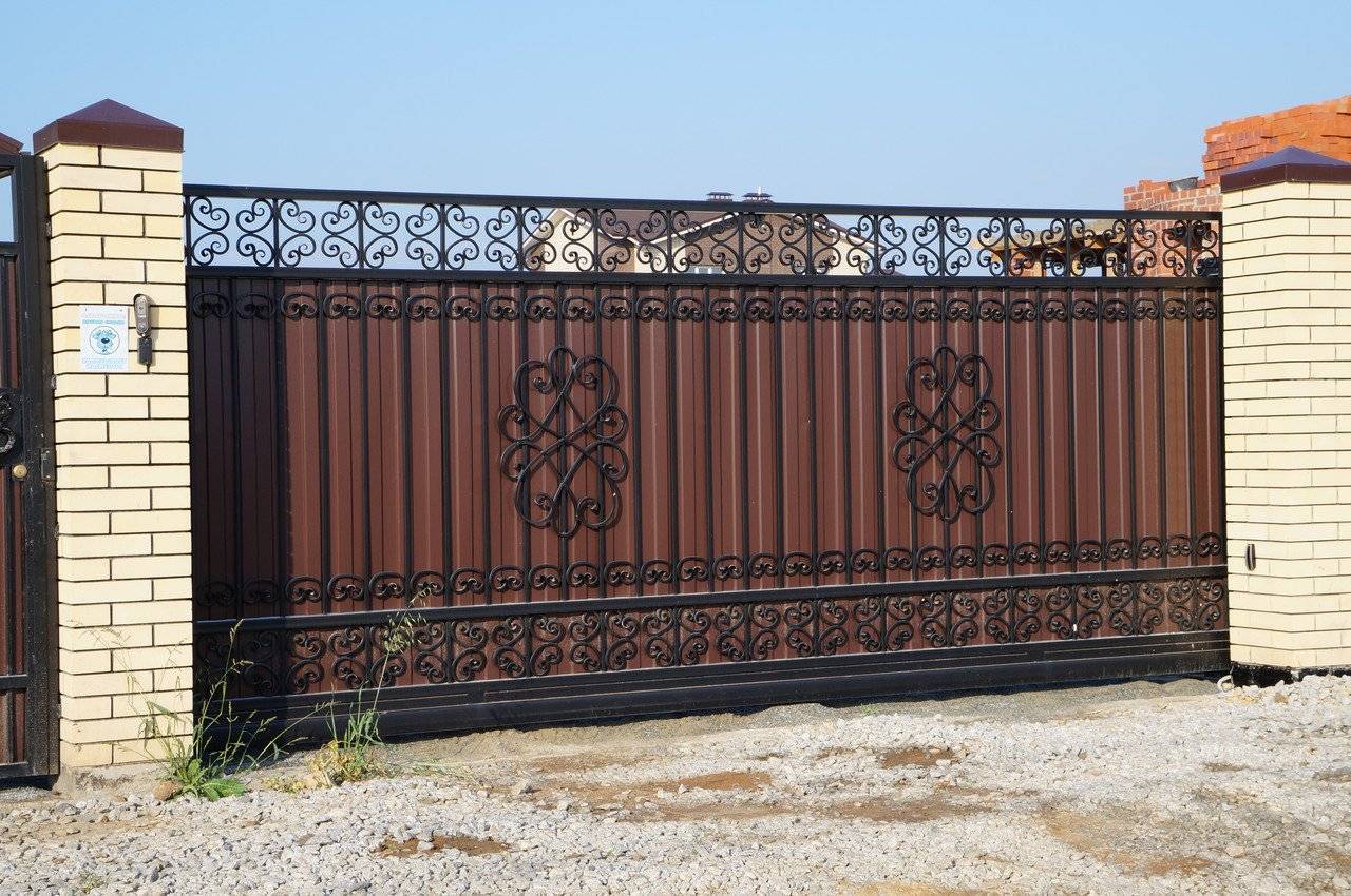 Откатные – двери открываются путем отката вбок. Для установки таких ворот необходимы верхние и нижние рельсы, по которым движется полотно. Бывают механические и автоматические. Идеальный вариант для маленьких участков. Такие ворота можно украсить как сверху, так и по всей поверхности коваными узорами.