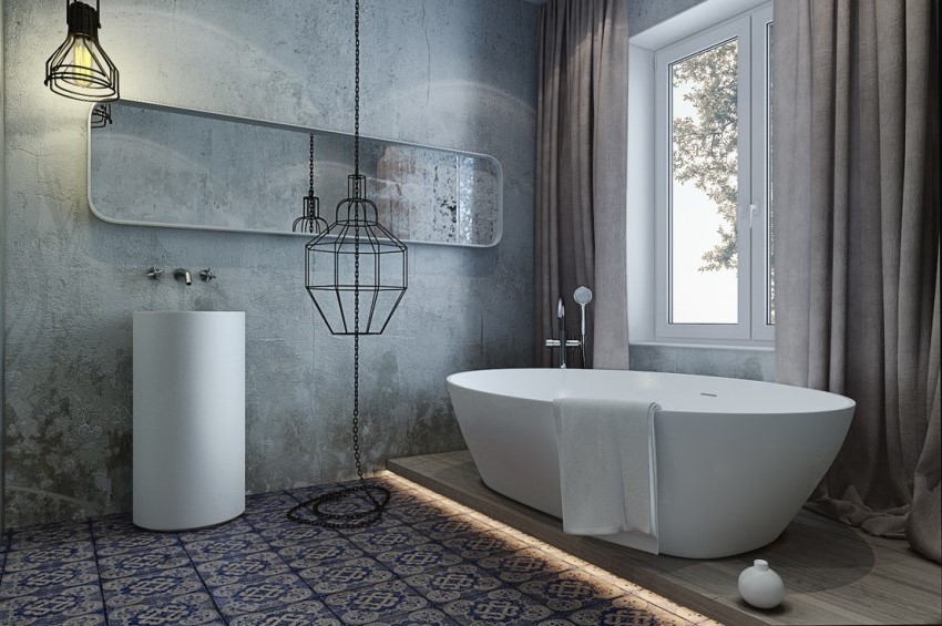 Для отделки ванных комнат также применяются минеральные штукатурки. Покрытие обладает паровой проницаемостью, благодаря чему в помещении сохраняется комфортный микроклимат. Срок службы этого материала составляет около 30 лет.