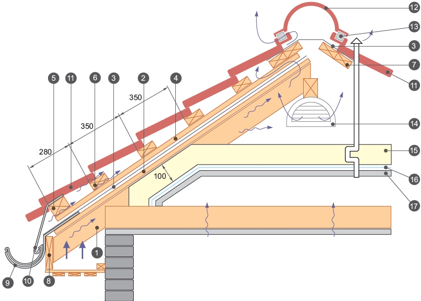 При устройстве всех кровельных систем, кроме опять же крыши с битумной черепицей, требуется обеспечение вентиляции пространства между кровлей и утепляющим пирогом, если он имеется, или гидроизоляцией, если утепления нет. Вентиляция в виде продухов обеспечивается укладкой контробрешетки.