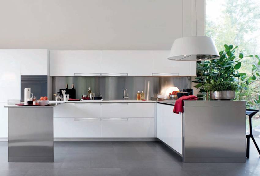 Многие современные кухни декорируются мебелью с металлическими фасадами и столешницами. Если вас привлек дизайн гарнитура из нержавейки, выберите варианты со специальным покрытием, предотвращающим появление следов от пальцев на поверхности.