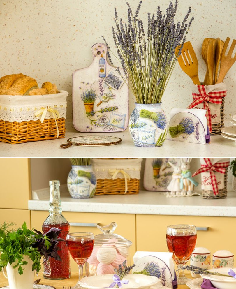 Думая о кухне в стиле прованс, который подразумевает очень женственное оформление, вы должны позаботиться о дополнениях, являющихся одним из ее самых важных элементов. Не должно быть недостатка в травах в очаровательных горшках, сухих букетах и свежих растениях, а также в большом количестве цветов, которые вставляются в кувшины или вазы. Рядом с ними хорошо выглядят различные шкатулки, рамы и шкатулки, представляющие собой сокровищницу милых безделушек. Все должно быть организовано со вкусом, чтобы не загромождать пространство.