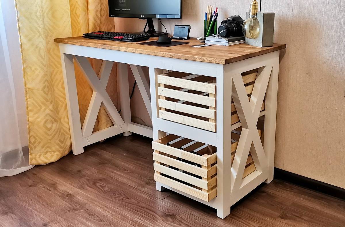 Применяя еврошурупы, соединяем ножки с поперечинами, размещая верхнюю из них таким образом, чтобы не дать возможности столешнице прогибаться. Нижнюю фиксируем на уровне 20-25 сантиметров от пола. На готовую опорную конструкцию помещаем столешницу, закрепляем ее посредством уголков. На стойки фиксируем ножки-накладки. Мебельные винты закрываем заглушками. Сборка закончена