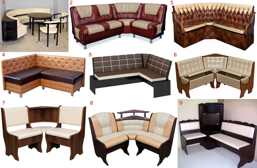 Основные виды кухонных уголков показаны на фото. Поз. 1 – эркерный уголок, круглый или граненый. Каждому седоку на уровне колен отводится оптимальная ширина сиденья ок. 400-450 мм. Эркерный уголок исключительно удобен и уютен, но, увы, сложен, дорог и требует для себя обширной кухни.