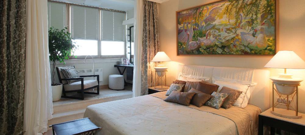 Еще один способ расширения полезной площади жилища – это создание дизайна интерьера гостиной, совмещенной со спальней. В этом случае вам не придется устранять уже упомянутые выше проблемы с неприятными запахами и шумом, потребуется лишь грамотно разделить помещение на зоны, подобрать цвета и определиться с мебелью.