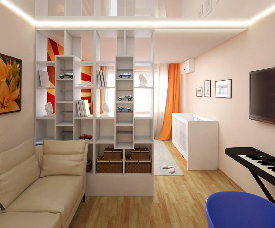 Молодая семья с сыном-дошкольником приобретает однокомнатную квартиру. Еслис кухней и санузлом все ясно, обустройство третьего помещения вызывает вопросы. Нужно уместить гостиную, спальню и детскую. Родителям хочется уединения, ребенок капризничает и требует отдельную комнату.