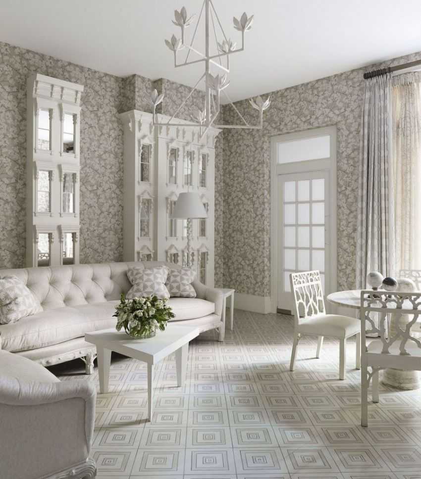 Интерьер отличается геометрическим рисунком, колоннами, потертой позолотой, а также напольными вазами, статуэтками и скульптурой. В такой гостиной должен быть мраморный или паркетный пол, классическая массивная мебель, стены с картинами и золотом, объемная люстра.