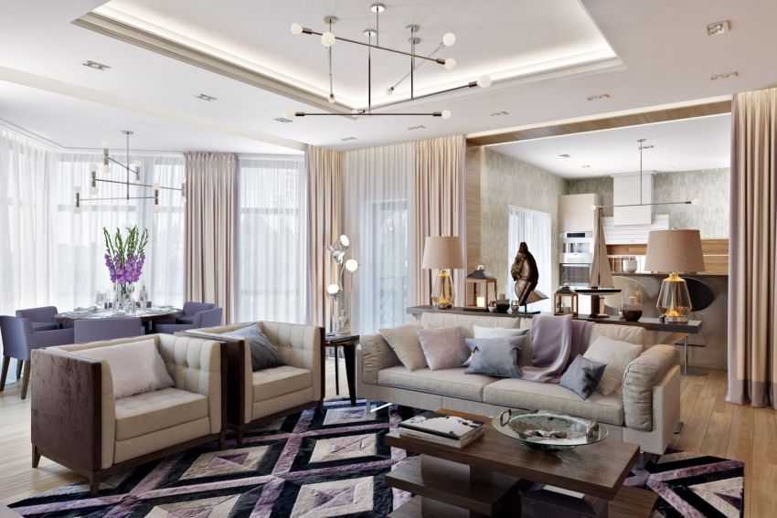 Интерьер отличается габаритами меблировки и относительно скромными аксессуарами, здесь нет эффектных аксессуаров и классика вписалась в современный быт. Приветствуется многоуровневый потолок, современная отделка, ламинат.