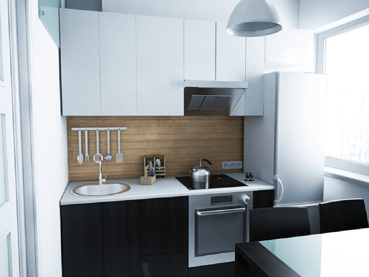 Линейная планировка для помещения 2*3 м тоже подходит идеально. Чаще всего вдоль длинной стенки устанавливают прямой кухонный гарнитур, подойдет любой малогабаритный, либо подбирают отдельные элементы из модульных комплектов. Минус схемы – места на холодильник не останется, треугольник тоже не получится. Линейная перепланировка – хороший вариант для людей, которые мало готовят, но едят обычно на кухне.