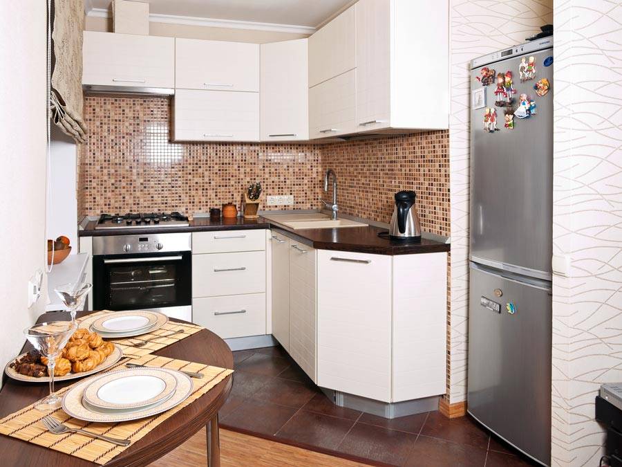 - если же ни один из приведенных вариантов не подходит, стоит рассмотреть, как обустраивают в хрущевках угловые кухни с холодильником. Обычно их располагают рядом с гарнитуром, устанавливая их как бы в нишу.