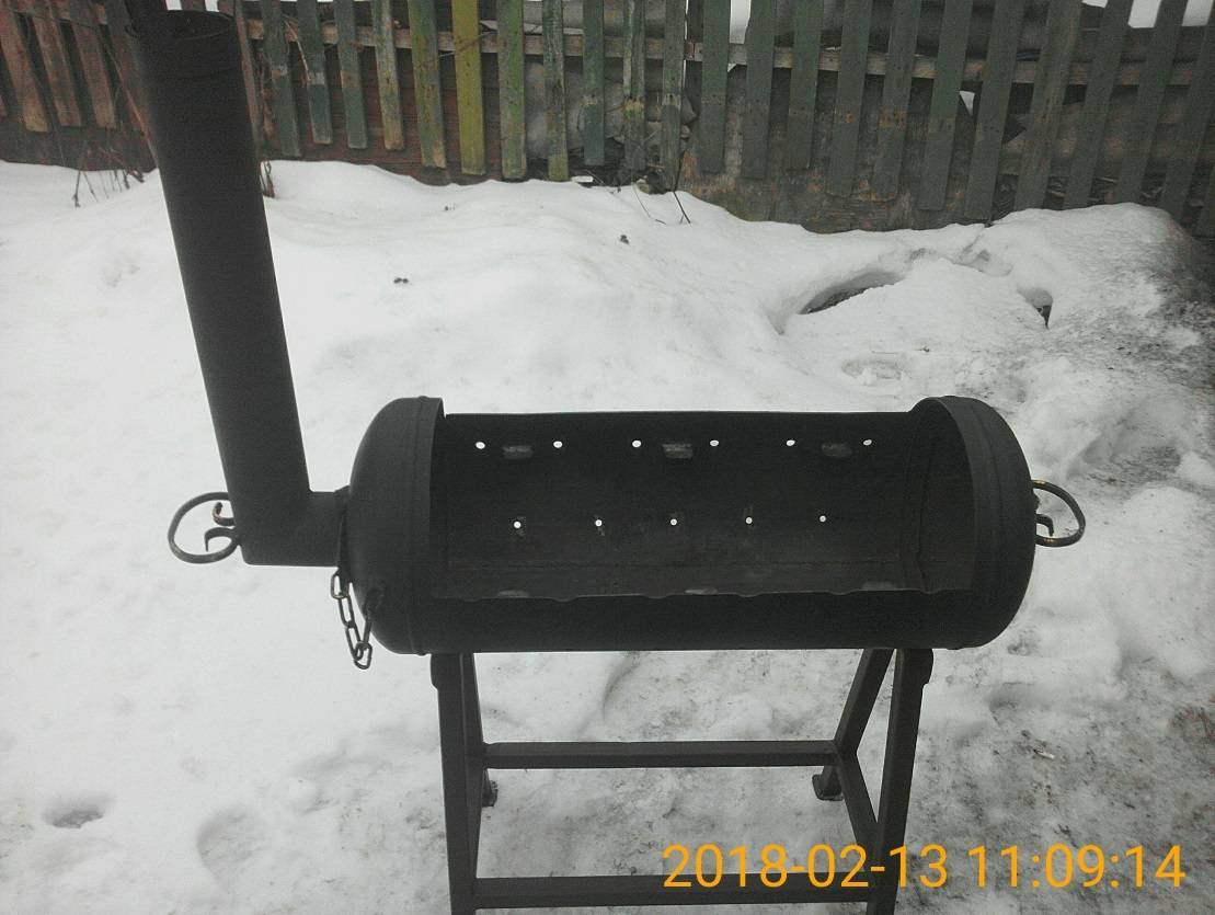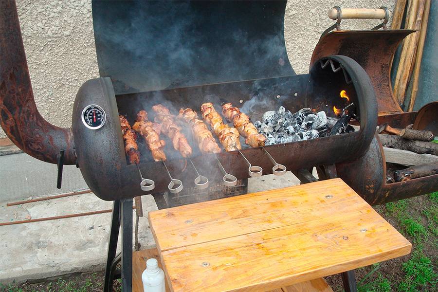 Дно баллона разрезается, и вы получите отверстие – это и будет топка. Обычно, наваривают толстые железные листы, чтобы коптильня прослужила вам долгие годы. В итоге у вас получится цельная конструкция, с дверкой и небольшой печкой. Обязательно приделайте трубу. Ее можно купить в специализированном магазине или на строительном рынке. Она должна быть среднего размера. Многие умельцы устанавливают специальный моторчик, с помощью которого будет вращаться мясо на вертеле. Но можно вешать куски мяса или тушки на небольшие крючки.
