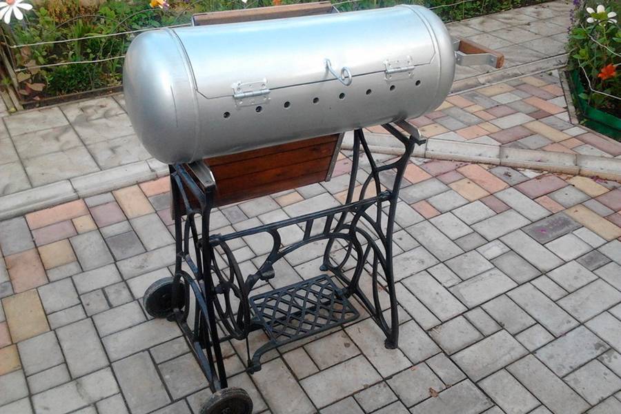 Здесь также использована станина от швейной машины, но боковые части раздвинуты по длине баллона, рядом с педалью, ныне подставкой для дров, расположен второй баллон. Таким образом, в мангал можно использовать для горячего копчения. Модель дополнена коваными деталями – держателем для полотенец, поварских принадлежностей, щетки и прочего.
