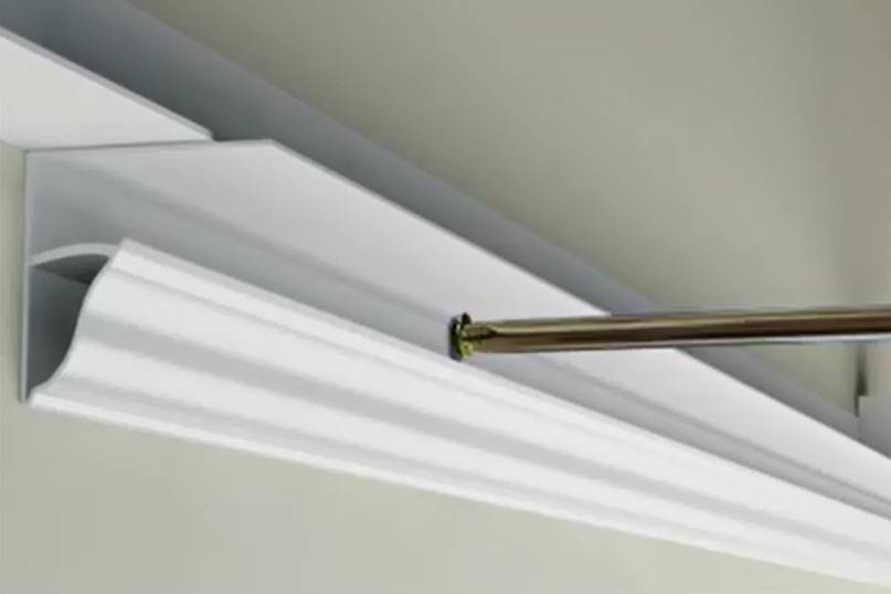 Шаг 5. Закрываем щель между стеной и потолком потолочным плинтусом. Потолок из МДФ панелей готов.