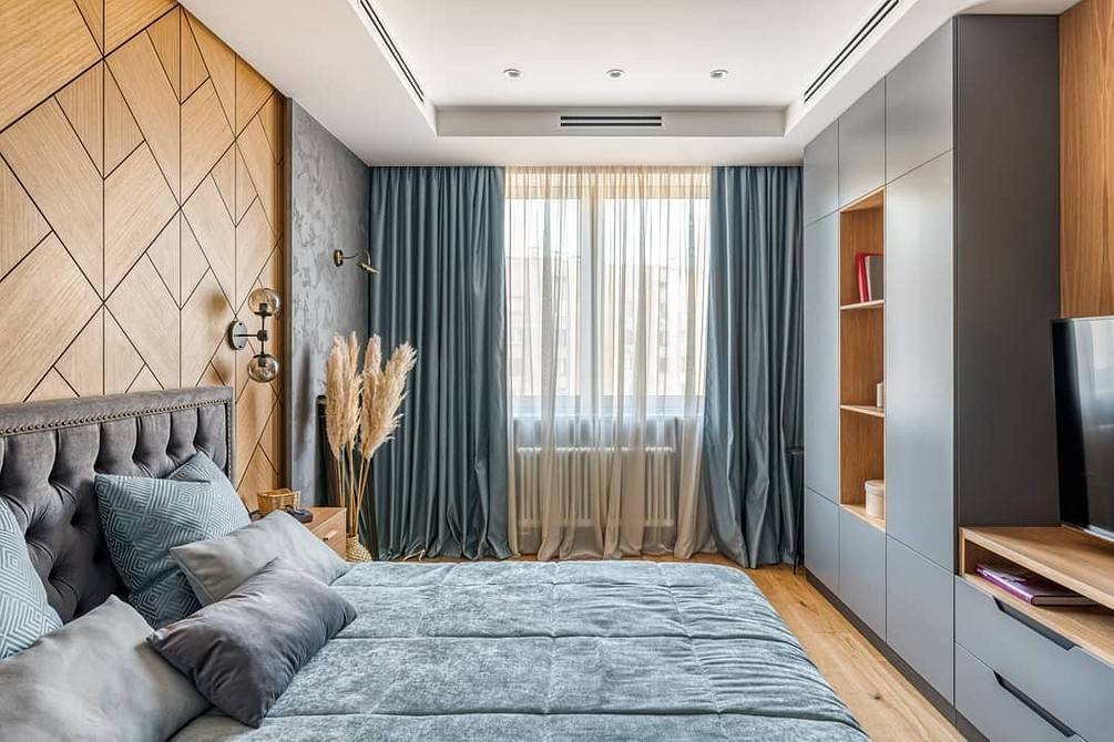На окна можно повесить жалюзи, рулонные шторы или портьеры. Шторы подбирают простого кроя плотные, не пропускающие свет и любопытные взгляды. Дополнительный уют в спальне создают локальные светильники, которые могут помочь в зонировании пространства.