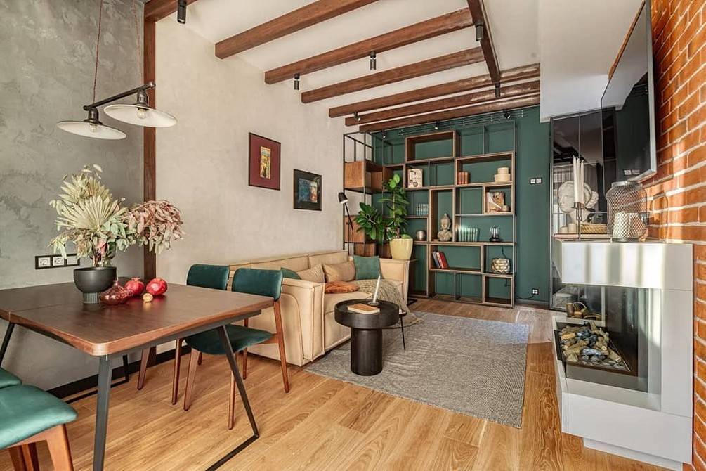 Помещение в таком дизайне смотрится очень пропорционально, неотделанные кирпичные стены в зале будут выгодно акцентировать внимание на мебели из экокожи и напольном покрытии цвета зеленой травы. Вместо занавесок на окна можно повесить рольшторы из натурального бамбука. В качестве декора на стены развешивают фотографии в рамках из натурального дерева, а на потолок крепят светильники, напоминающие бутоны цветов