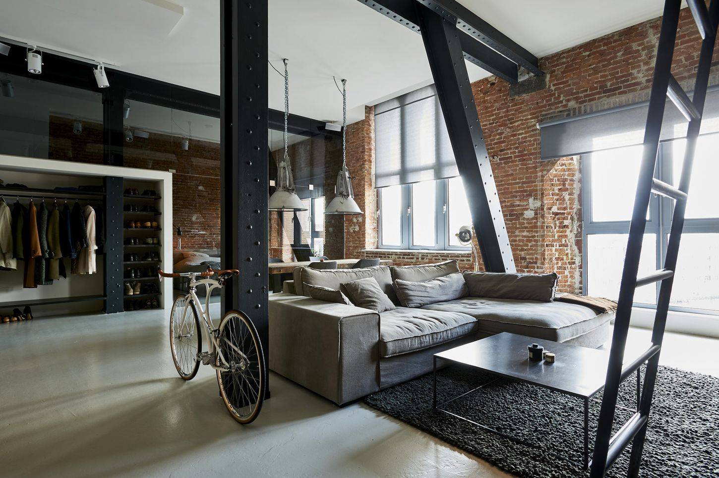 Если есть возможность, начните с мебели. Выбирайте металлические черные стеллажи для зонирования пространства и открытого хранения, массивный кожаный диван в гостиную