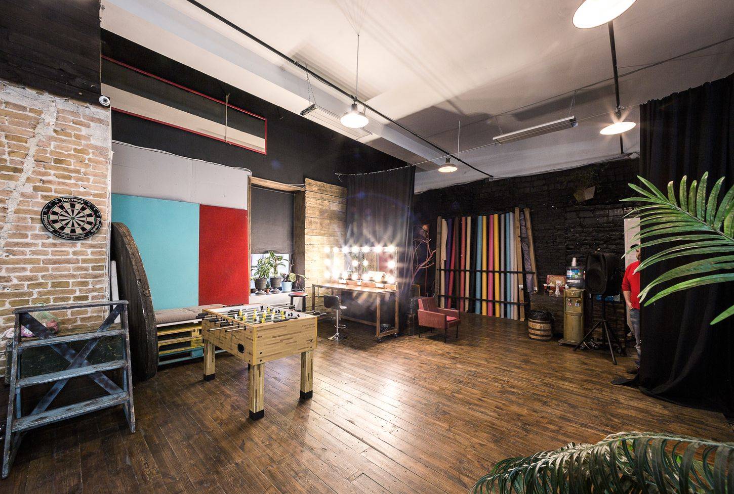 - Большие окна, высокие потолки (преимущественно белые) Под потолком обычно пускают массивные балки, вентиляционные трубы, провода.