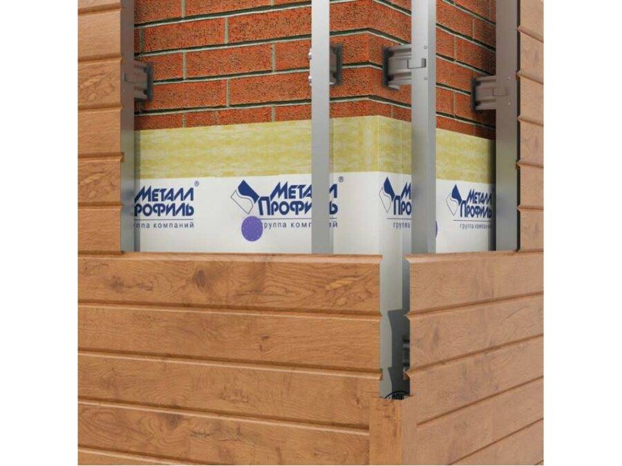 - в зазор между стеной и профилем укладывается утеплитель. Используется недорогая минеральная вата или пенополистирол. Для защиты от ветра прокладывается специальная мембрана. Материал предпочтительнее обычной, часто используемой, полиэтиленовой пленки. Состав пропускает влажный пар, испаряющиеся от поверхности здания, и одновременно защищает стены от атмосферных осадков;